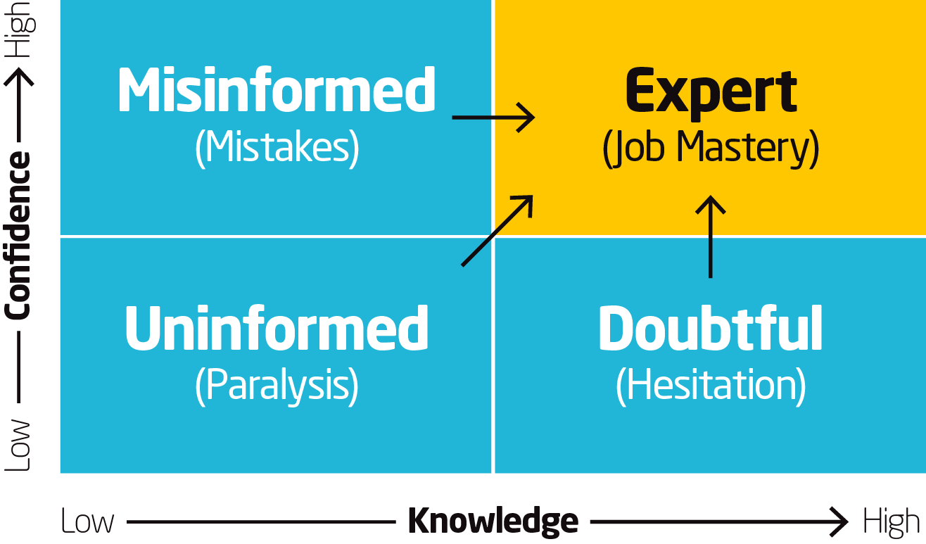 Every single one of your workers fits into one of the categories in the Knowledge Confidence Square. Think about your team as we move through each square: Who is often full of doubt? Who is uninformed? Who has reached a mastery level?
